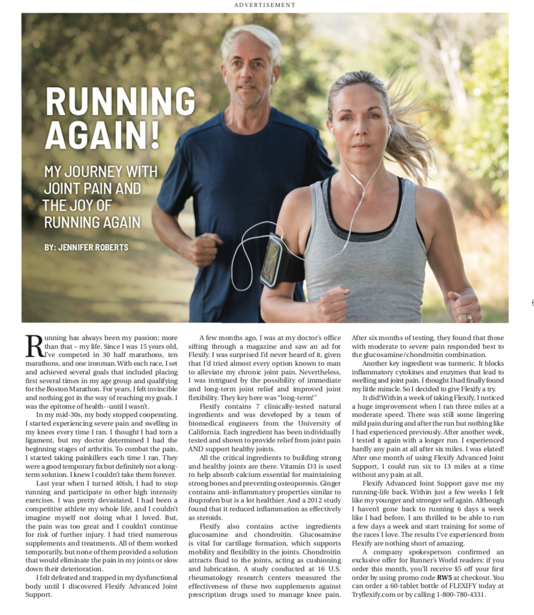 Wrote ten advertorials for Runner’s World for multiple audiences that promoted the advanced joint support supplement Flexibly. These articles were part of their first phased approach of launching their brand, building trust and awareness, and eventually achieving business growth and sales.
